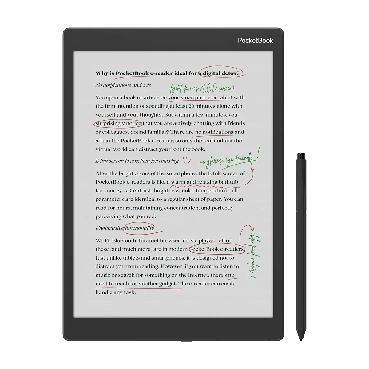 PocketBook Color Note zastąpi zarówno zeszyt, tablet, jak i komputer. To e-notatnik stworzony po to, by każdego dnia zaskakiwać Cię wszechstronnością. Precyzyjny rysik umożliwia tworzenie dokładnych szkiców oraz ułatwia zaznaczanie ważnych fragmentów w tekście. Dostępne różnorodne narzędzia do pisania odręcznego sprawiają, że notowanie stanie się czystą przyjemnością.
