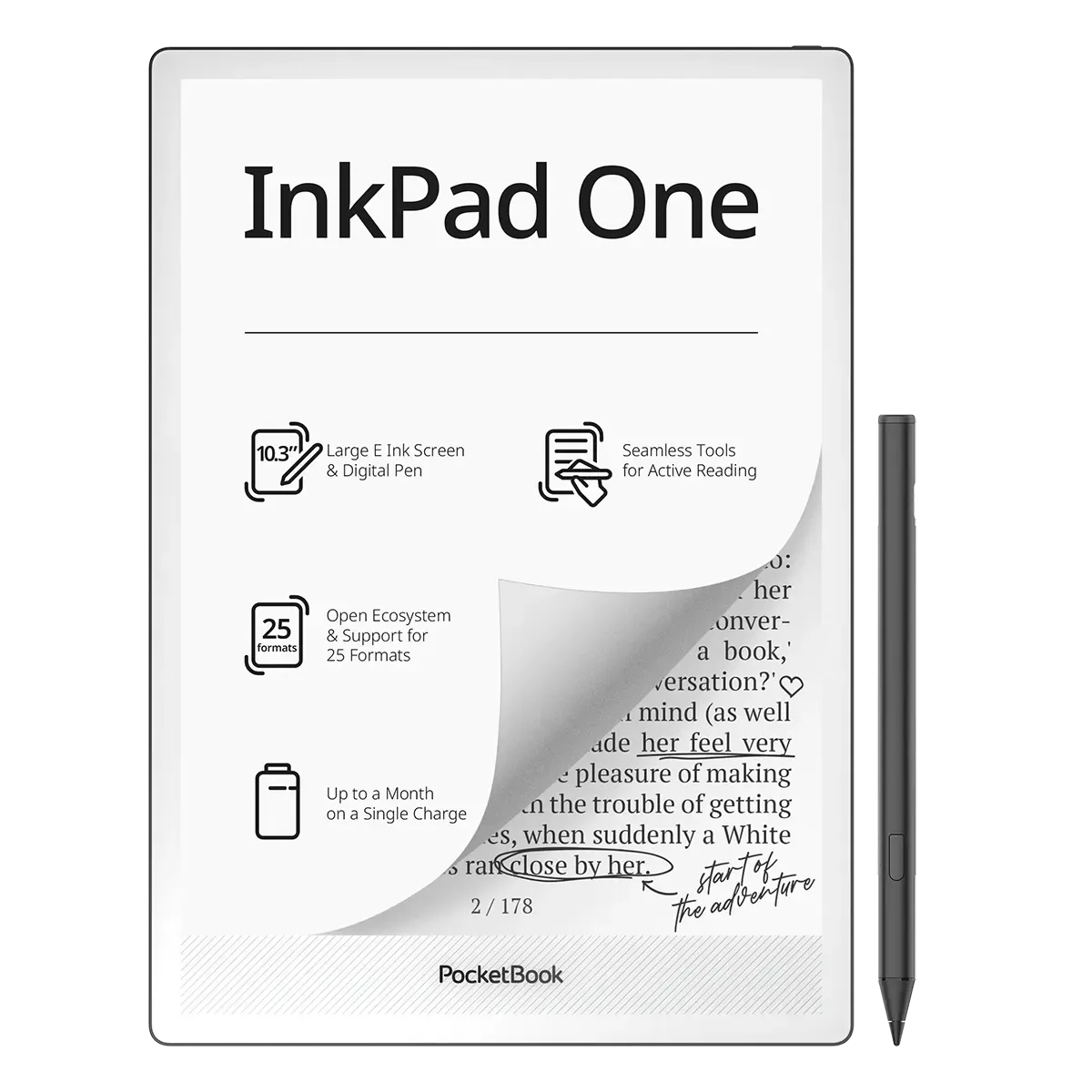 PocketBook InkPad One to duży czytnik e-booków stworzony do czytania i pracy z tekstem na wygodnym, 10,3-calowym ekranie. Pozwala nie tylko czytać książki, ale także podkreślać, dopisywać notatki i pracować z dokumentami przy użyciu rysika PocketBook Stylus 2 dołączonego w zestawie, zachowując prostotę i przejrzystość klasycznego czytnika E Ink.